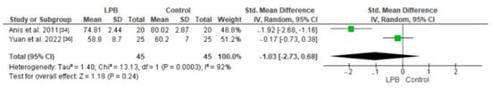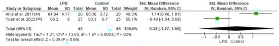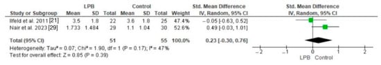 As shown in Figure 4, LPB-treated patients had significantly lower pain scores (VAS) than controls without LPB, with a p-value of 0.02. Conversely, pain scores (NRS) exhibited high heterogeneity, as seen in Figure 5. The differences in pain scores among LPB-treated patients and controls without LPB were statistically insignificant, with a p-value of 0.39.
