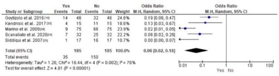 The overarching cortisol levels after 12 h post-operatively illustrate heterogeneity and an overall statistically insignificant difference in the concentration between the LPB group and the controls (p-value 0.35). Figure 6 shows a forest plot comparing cortisol levels among LPB-treated patients and the controls.