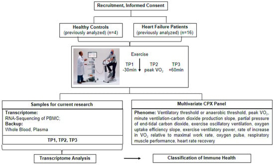 Cardiorespiratory fitness, defined as the ability of the circulatory and respiratory systems to supply oxygen to skeletal muscles during sustained physical activity correlates with immune health. Maintaining cardiorespiratory fitness exerts beneficial immunological effects [,]. It has the potential to delay, halt, or even reverse the age-associated decline in immune function [,]. Fitness is hypothesized to be linked to leukocyte gene expression in both healthy individuals and Heart Failure (HF) patients by regulating various physiological processes involved in oxygen uptake and utilization during exercise.