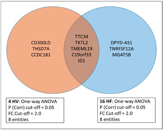 1.3: Next, we were interested in what extent the 11 strenuous-activity-bout-associated genes identified in the overall cohort were differentially expressed between HV (n = 4) and HF (n = 16) subjects, applying the same statistical criteria (20–100% restriction, FDR-correction (p-value 0.05) and 2.0-fold change across the three TPs). By performing 1-way ANOVA, we identified 8/11 genes in each of the two groups (HV versus HF) while 5 of the genes (TTC34, TMEM119, C19orf33, ID1, TKTL2) overlapped between the two groups as represented in the Venn diagram, suggesting some biological regulation differences in the PBMC pool (Figure 4). According to further clustering analyses with the 11 genes and their expression in all 20 subjects, we concluded that they did not have a close correlation to the clinical phenotypes (HV, HF1 and HF2 cohorts) at TP1 (resting state) and TP3 (Recovery state) but showed some correlation with HV/HF-state at peak exercise (Figure 5). At peak exercise (TP2), there were two main clusters differentiating severe HF from mild HF and HV and other cluster-mild HF and HV groups.