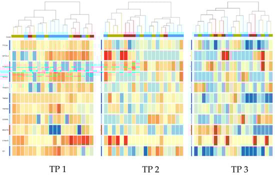 Cluster entities diagram for all 20 subjects and TP1, TP2 and TP3 with FC cut-off 2.0 and 11 genes. Top to bottom: TTC34, DPYD-AS1, CCDC181, TKTL2, THSD7A, TMEML19, TNRFSF12A, CD300LD, MGAT5B, C19orf33, ID1.