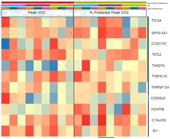 Covariate regression analysis shows an expression of the 11 genes across all three TPs for HV and HF groups in correlation to VO2max and % predicted oxygen uptake. The color coding depicts a positive (red) and a negative (blue) correlation. The darker the color the stronger the respective correlation. Top to bottom: TTC34, DPYD-AS1, CCDC181, TKTL2, THSD7A, TMEM119, TNFRSF12A, CD300LD, MGAT5B, C19orf33, ID1.