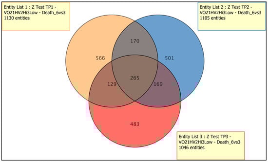 3.1: Next, we were interested in understanding the correlation between genes associated with death in the severe HF group (n-9), analyzed by time-point (TP1, TP2, TP3) and as shared gene set represented by the Venn diagram (Figure 7). We found 265 genes which are differentially expressed between those who survived and those who died.