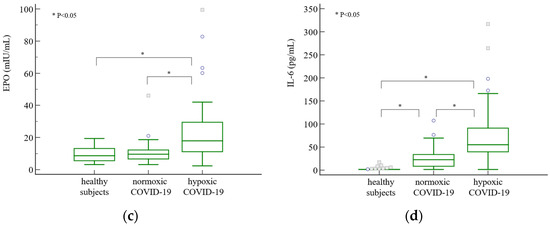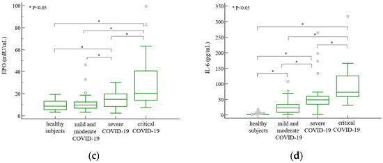 - Yağcı, S.; Serin, E.; Acicbe, Ö.; Zeren, M.İ.; Odabaşı, M.S. The Relationship between Serum Erythropoietin, Hepcidin, and Haptoglobin Levels with Disease Severity and Other Biochemical Values in Patients with COVID-19. Int. J. Lab. Hematol. 2021, 43, 142–151. [Google Scholar] [CrossRef] [PubMed]
