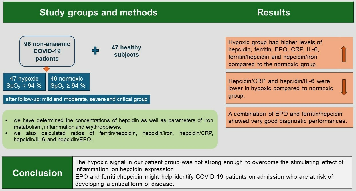 Gugo, K.; Tandara, L.; Juricic, G.; Pavicic Ivelja, M.; Rumora, L. Effects of Hypoxia and Inflammation on Hepcidin Concentration in Non-Anaemic COVID-19 Patients. J. Clin. Med. 2024, 13, 3201. https://doi.org/10.3390/jcm13113201