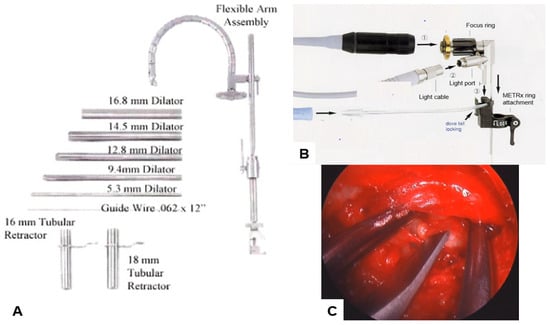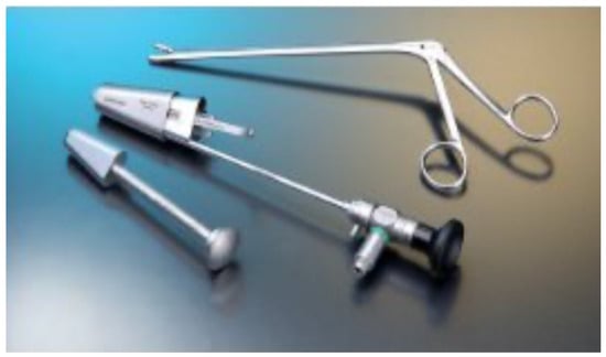 This technique requires the use of a specialized system called the Destandau Endospine System (Karl Storz, Tuttlingen, Germany, Figure 2), which comprises an endospine tube, trocar, and a working insert. The working insert comprises four ports—4-mm endoscope (0°), 4-mm suction cannula, 8-mm for the working instrument, and nerve root retractor [38]. There are numerous applications of the Destandau system, ranging from degenerative spinal conditions to intradural tumor surgery [22].