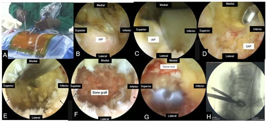 Unilateral biportal endoscopic transforaminal lumbar interbody fusion. (A) Scopic and Instrument portals, (B) Endoscopic view after soft tissue dissection, (C) Osteotomy of inferior articular process (IAP), (D) Resection of the tip of superior articular process (SAP), (E,F) Removal of disc and preparation of disc space, (G) Endoscopic view showing insertion of cage, (H) Final position of cage. This step is followed by insertion of percutaneous pedicle screws under fluoroscopic guidance.