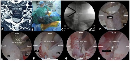 UBE cervical foraminotomy and laminectomy. (A)Axial section through C5-C6 disc showing left-sided disc osteophyte complex with impingement of left C6 nerve root, (B) Intra-operative surgical view, (C) Intra-operative fluoroscopic view showing targeting of V point, i.e., junction of inferior articular process (IAP) with superior articular process (SAP), (D) Endoscopic view showing identification of V point. (E) Beginning of decompression by burring of IAP (F,G) Resection of IAP and SAP with Kerrison rongeurs, (H) Final image showing adequate decompression of the nerve root.
