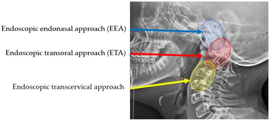 The craniovertebral junction (CVJ) is an important structure because this part includes the medulla and multiple cranial nerves. CVJ is also approximated by critical vasculature supplying the brain. Congenital, developmental, and acquired disorders can affect CVJ, and surgical treatment remains challenging because of the complex anatomic and biomechanical characteristics of the region [102]. For many years, the microsurgical transoral technique has been applied as the standard method for the anterior approach to CVJ [103]. However, bacterial contamination, postoperative nasogastric tube feeding, and swelling of the tongue have been reported with this approach [104,105]. Recently, several endoscopic methods were reported regarding approaches to CVJ due to the advancement of endoscopic techniques [106,107] (Table 5 and Figure 7).