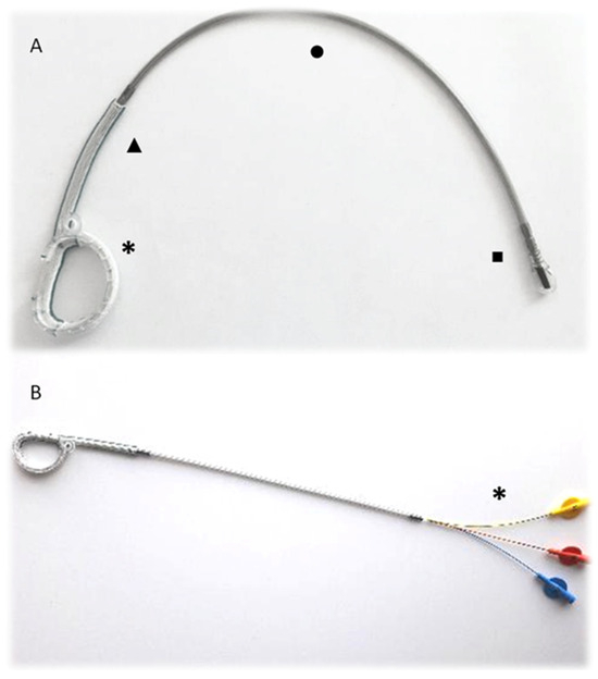 (A): The study device consists of a deformable annuloplasty ring (*), a proximal, textile-covered part of the connection line (▲), a distal detachable part of the connection line (●), and the long exchangeable plug mandrel inserted within the connection line for sealing (■) (B): A dedicated three-balloon catheter (*) for post-implantation adjustment is inserted within the connection line.