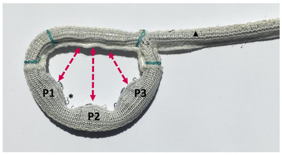 KD1 Device with posterior ring segments in fully expanded position; * indicating eyelets for suture placement on the posterior aspect of the ring; ▲ indicating the proximal part of the connection line, allowing the insertion of a balloon-catheter for ring adjustment.