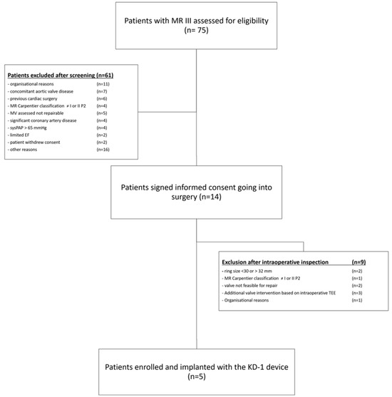 Seventy-five patients were screened, and 14 patients signed the informed consent form, of which nine were excluded intraoperatively due to the necessity of additional valve interventions based on the intraoperative TEE (trans-esophageal echocardiography) (n = 3), a required ring size smaller than 30 mm or greater than 32 mm (n = 2), a mitral valve deemed not feasible for reconstruction (n = 2), a Carpentier’s classification other than I or II P2 (n = 1), and organizational reasons (n = 1) (Figure 4—Consort Flow Diagram). Five patients (75.4 ± 6.1 years; EuroSCORE II 2.1 ± 0.9%; three female) were deemed eligible during surgery and successfully implanted with the study device. Patients were rather low-risk without concomitant bypass surgery or aortic valve procedures due to the inclusion/exclusion criteria (Table 1). Mechanisms of mitral regurgitation were prolapse of the P2-segment in three patients and annular dilation in two patients.