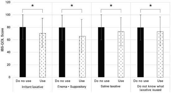Japanese version of the Irritable Bowel Syndrome Quality of Life (IBS-QOL-J) score for different laxatives used. Bar graphs of the IBS-QOL-J score for individuals using a particular laxative or not are shown. The results are expressed as mean ± standard deviation. * p < 0.001 indicates significantly different from non-usage (Mann–Whitney U test).