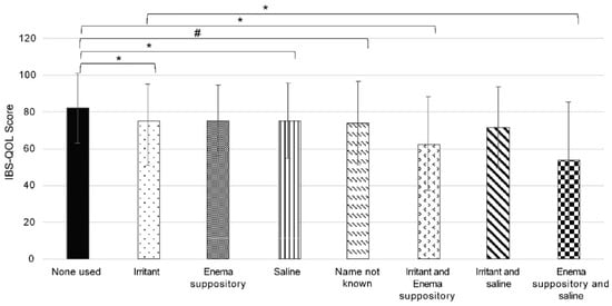 Japanese version of the Irritable Bowel Syndrome Quality of Life (IBS-QOL-J) score according to the laxative or laxative combinations used. Bar graphs of the IBS-QOL-J scores for individuals using one laxative or a combination of laxatives are shown. The results are expressed as the mean ± standard deviation. * p < 0.001 and # p < 0.05 indicate a statistically significant difference using the Mann–Whitney U test followed by Bonferroni correction.