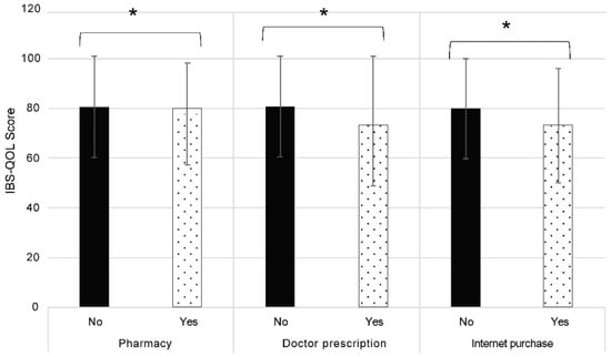 Japanese version of the Irritable Bowel Syndrome Quality of Life (IBS-QOL-J) score according to mode of purchase. Bar graphs of the IBS-QOL-J score depending on how the medication was purchased are shown. The results are expressed as mean ± standard deviation. Statistical significance was determined at * p < 0.0001 using the Mann–Whitney U test.