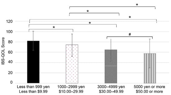 Japanese version of the Irritable Bowel Syndrome Quality of Life (IBS-QOL-J) score according to treatment cost per month expressed in JPY and USD. Bar graphs of the IBS-QOL-J score depending on treatment cost are shown. The results are expressed as mean ± standard deviation. * p < 0.001 and # p < 0.05 indicate a statistically significant difference using the Mann–Whitney U test followed by Bonferroni correction.