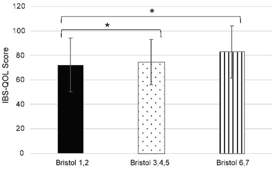Japanese version of the Irritable Bowel Syndrome Quality of Life (IBS-QOL-J) score according to the Bristol Stool Form Score (BSFS). Bar graphs of the IBS-QOL-J score depending on the BSFS score are shown. The BSFS was grouped into 3 groups, with Type 1 and 2 indicating severe constipation, Types 3–5 indicating normal stools, and Types 6 and 7 indicating diarrhea. The results are expressed as mean ± standard deviation. Significance was determined at * p < 0.001 using the Kruskal–Wallis test followed by Bonferroni correction.