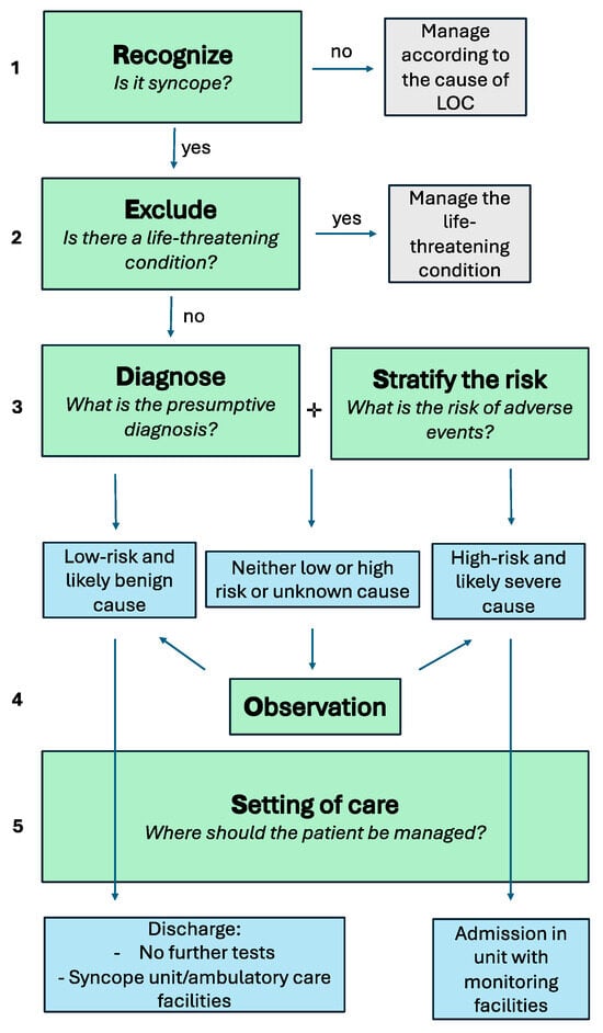 In this review, we propose as a practical tool the acronym RED-SOS: Recognize syncope; Exclude life-threatening conditions; Diagnose; Stratify the risk of adverse events; Observe; decide on the Setting of care (Figure 1).