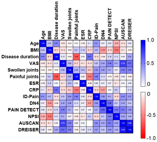 Correlation matrix. Negative correlations are displayed in red, while positive correlations are in blue. BMI = body max index; VAS = visual analog scale; ESR = erythrocyte sedimentation rate; CRP = C-reactive protein; ID-Pain = ID pain neuropathic pain-screening questionnaire; DN4 = Douleur Neuropathique en 4 Questions; NPSI = Neuropathic Pain Symptom Inventory; AUSCAN = Australian/Canadian Osteoarthritis Hand Index; Dreiser = Dreiser’s algofunctional finger index.