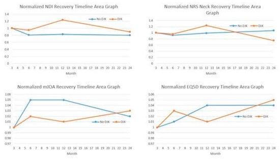 Normalized HRQLs were developed and analyzed, permitting the calculation of an integrated health state using the following validated novel area-under-the-curve methodology [,]. Collected HRQL metrics at any postoperative timepoint (e.g., 3-month, 6-month, 1-year, and 2-year) were divided by the corresponding preoperative score for each patient. The resulting preoperative normalized HRQL score for all patients was therefore 1, with any follow-up normalized HRQL score being >1, equal to 1, or <1, corresponding to whether the patient improved or deteriorated relative to baseline. Normalized HRQL scores were then plotted on an area graph, with the x-axis representing time (in months, starting at the preoperative interval) and the y-axis representing normalized HRQL scores (Figure 1). Regarding Integrated Health State (IHS) values for varying outcome metrics, lower NDI IH, lower NRS neck his, and higher mJOA IHS scores indicated a better outcome (better recovery process).