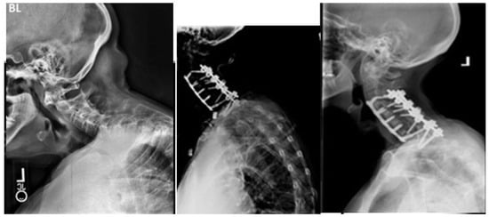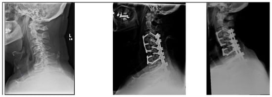 A 71-year-old female from the DJK group. Images from left-to-right: preoperative, immediate postoperative, and 3-month postoperative X-rays. History of progressive right-sided neck pain with progressive radiculopathy and myelopathy. Symptoms unresolved with conservative measures. Underwent C3–C7 ACDF with C3-T1 posterior fusion. Symptoms initially showed some improvement up to 6 weeks, before showing gradual worsening.