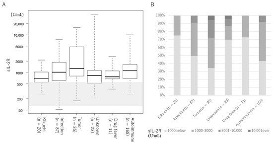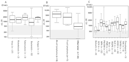 Serum sIL-2R levels by disease. Shaded areas indicate the reference values for sIL-2R (145–519 U/mL). (A) Patients with infectious diseases. (B) Patients with tumors. (C) Patients with autoimmune diseases.