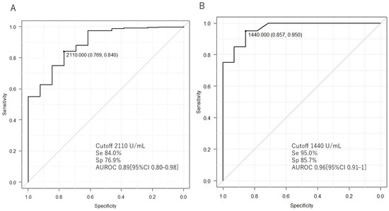 Comparison of serum sIL-2R levels between lymphoma, non-lymphoma, and Kikuchi disease. The area under the curve (AUROC) for the receiver operating characteristic (ROC) analysis of serum sIL-2R is shown. (A) Comparison of lymphoma and non-lymphoma. (B) Comparison of lymphoma and Kikuchi disease. Se: sensitivity; Sp: specificity.