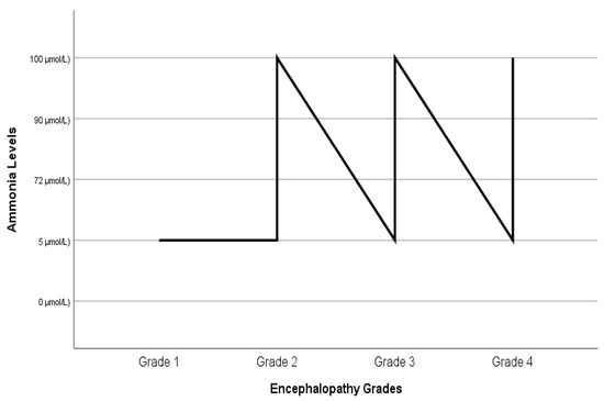Serum ammonia levels are a controversial issue in defining hepatic encephalopathy. There is no consensus on the rating of ammonia levels. We rated ammonia levels in line with common practice and expert opinion. Accordingly, the range for normal people is from 5 to 53 μmol/L, for slightly elevated people it is from 54 to 72 μmol/L, for high ammonia level it is from 73 to 80 μmol/L, for very high ammonia level it is from 81 to 90 μmol/L. For extremely high, the range from 91 to 100 μmol/L was accepted [25,26,27,28,29].
