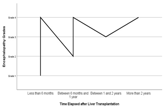 We concluded that the encephalopathy stages of the patients regressed as time passed after liver transplantation (p = 0.000, Phi = 1.587, and Cramer’s V = 0.916). Additionally, all patients who had undergone transplant surgery more than 2 years ago were in the first-stage hepatic encephalopathy category. Although this situation was pleasing in comparison to transplant patients with advanced hepatic encephalopathy, it was not a satisfying result in that the patients who had undergone transplant surgery more than 2 years ago had not fully recovered. Similar research has found that the presence of a persistent shunt, the development of ischemic brain injury during the intraoperative process, and/or permanent brain damage prior to transplantation all cause irreversible hepatic encephalopathy in the post-transplant period [39,40,41,42]. The findings of our study supported the results in the relevant literature.