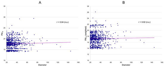 Association of PAA diameter and 10-year mean PM10 (A) and weighted 10-year mean PM10 (B) (all mcg/m3).