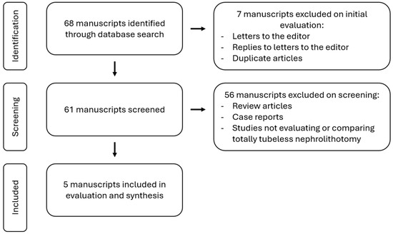 We performed a MEDLINE database search using the following terms: totally tubeless percutaneous nephrolithotomy, tubeless percutaneous nephrolithotomy, outcomes, and the MeSH term percutaneous nephrolithotomy. The articles found included articles dated from 1986 to 2023. A variety of articles were screened including prior review articles, meta-analyses, systematic reviews, primary research articles, case reports, and case studies. Ultimately, five studies were included that compared tt-PCNL to alternative techniques. Our search criteria and screening process are summarized in Figure 1. Across all five studies, 442 patients were included in the comparison. These five studies were evaluated and summarized as a narrative review. Table 1 summarizes the five studies and their methodology.