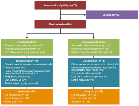 A total of 263 patients were randomized to either of the two treatment arms, 231 of whom met the inclusion/exclusion criteria and were given both study treatments and EGD more than once. These 231 patients were assigned to the FAS. Of these, 218 patients completed the current study without serious protocol violation and were assigned to the PPS. Moreover, a total of 263 patients were randomized to either of the two treatment arms, one (0.38%) of whom did not receive study treatments. Therefore, the remaining 262 patients (99.62%) received study treatments more than once and were assigned to the safety set.
