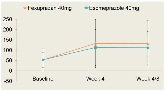 Changes in the serum gastrin levels at 4 and 8 weeks from baseline were presented as the least square mean with 95% confidence intervals; they were measured as 21.37 pg/mL (−4.98–47.72) in the fexuprazan 40 mg group and 22.08 pg/mL (−2.68–46.83) in the esomeprazole 40 mg group. But this difference reached no statistical significance (p > 0.05).
