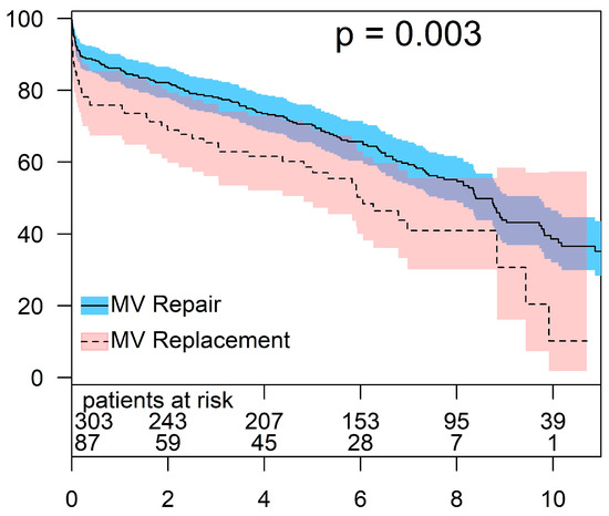 The overall 30-day mortality rate was 8.5% (n = 33), and it was significantly lower in patients who underwent MV repair compared to those who underwent MV replacement (8.5% vs. 14.9%, p = 0.026). At the latest follow-up, 225 patients were alive (57.7%). Amongst those, 182 patients were in the repair group, and 43 patients were in the replacement group. The overall survival was significantly lower in patients who underwent MV replacement for FMR. The estimated 1-, 5-, and 8-year survival rates for the repair group were 86.1 ± 2.0%, 70.2 ± 2.7%, and 55.1 ± 3.1%, respectively. For the same intervals, the survival rates in patients who underwent MV replacement were 75.9 ± 4.6, 58.6 ± 5.4, and 40.9 ± 6.4%, respectively (p = 0.003) (Figure 1).