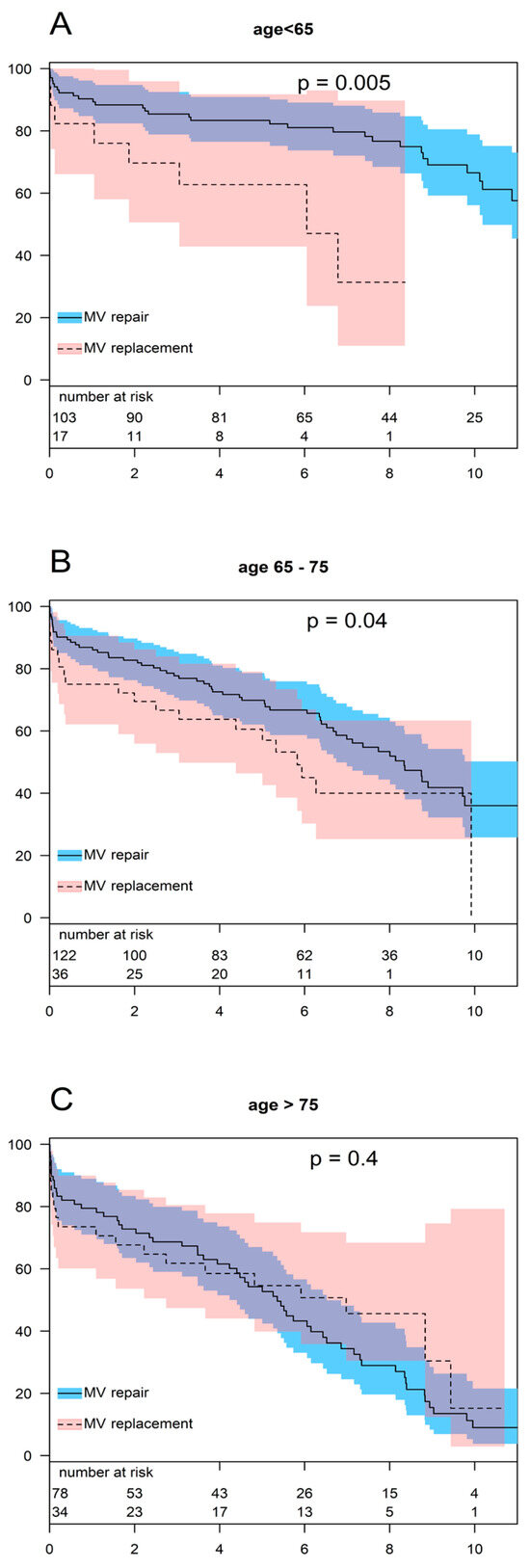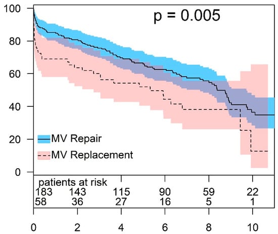The findings from our regression model showed the superiority of MV repair in patients younger than 65 years. Figure 5 shows a comparison of the survival rates for MV repairs and MV replacements stratified by age. Survival was significantly higher in younger patients who underwent MV repair compared to those who underwent MV replacement (p = 0.005). After 1, 5, and 8 years, the survival rates in the repair group were 90.3 ± 2.5%, 83.4 ± 3.6%, and 76.7 ± 4.6%, respectively. For the same intervals, the survival rates of patients who underwent MV replacement were 82.4 ± 9.2%, 62.7 ± 12.1%, and 31.4 ± 16.8%, respectively.