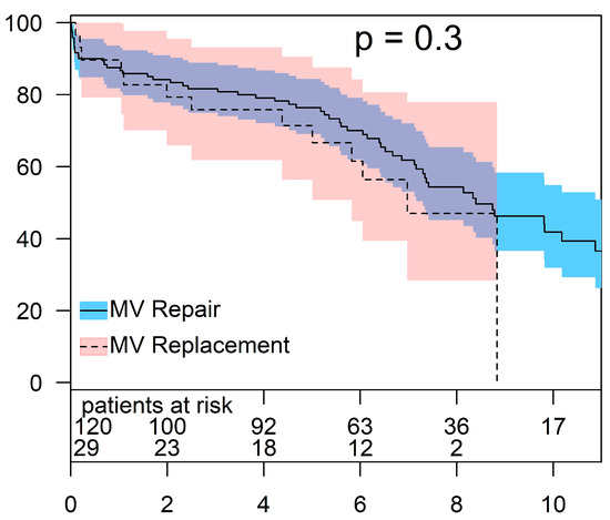 Patients with non-ischemic origin of MR had an overall 30-day mortality of 5.4% (8/149 patients). The 30-day mortality for patients undergoing MV repair and MV replacement was 6.7% (8/120) und 0% (0/29), respectively. In this cohort, the overall survival in patients who underwent MV repair was 87.5 ± 3.0%, 76.4 ± 3.9%, and 54.3 ± 5.1% at 1, 5, and 8 years, respectively. For the same intervals, the survival rates in patients who underwent MV replacement were 89.7 ± 5.7%, 71.4 ± 8.6%, and 47.0 ± 12.1%, respectively (p = 0.3) (Figure 3).