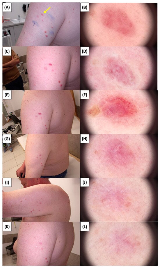 Involution of Basal Cell Carcinoma (BCC) on the Arm Treated with High-Intensity Focused Ultrasound (HIFU). (A) Macroscopic view before HIFU treatment; (B) Dermoscopic view before HIFU treatment; (C) Macroscopic view immediately after HIFU treatment; (D) Dermoscopic view immediately after HIFU treatment; (E) Macroscopic view 2 weeks post-HIFU; (F) Dermoscopic view 2 weeks post-HIFU; (G) Macroscopic view 3 months post-HIFU; (H) Dermoscopic view 3 months post-HIFU; (I) Macroscopic view 6 months post-HIFU; (J) Dermoscopic view 6 months post-HIFU; (K) Macroscopic view 1 year post-HIFU; (L) Dermoscopic view 1 year post-HIFU. Yellow arrows indicate the area of the treated lesion.