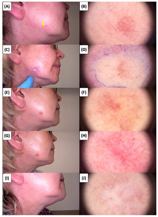 Involution of Basal Cell Carcinoma (BCC) on the cheek treated with High-Intensity Focused Ultrasound (HIFU). (A) Macroscopic view before HIFU treatment; (B) Dermoscopic view before HIFU treatment; (C) Macroscopic view immediately after HIFU treatment; (D) Dermoscopic view immediately after HIFU treatment; (E) Macroscopic view 2 weeks post-HIFU; (F) Dermoscopic view 2 weeks post-HIFU; (G) Macroscopic view 3 months post-HIFU; (H) Dermoscopic view 3 months post-HIFU; (I) Macroscopic view 6 months post-HIFU; (J) Dermoscopic view 6 months post-HIFU. The yellow arrow indicates the area of the lesion.