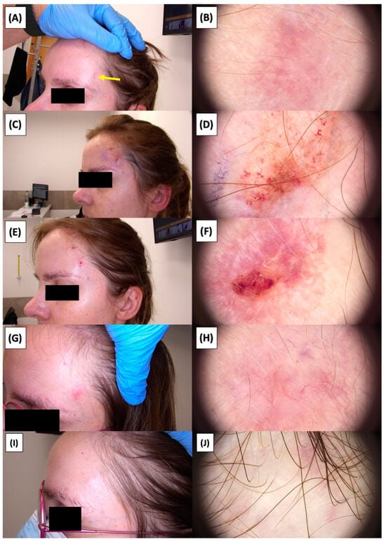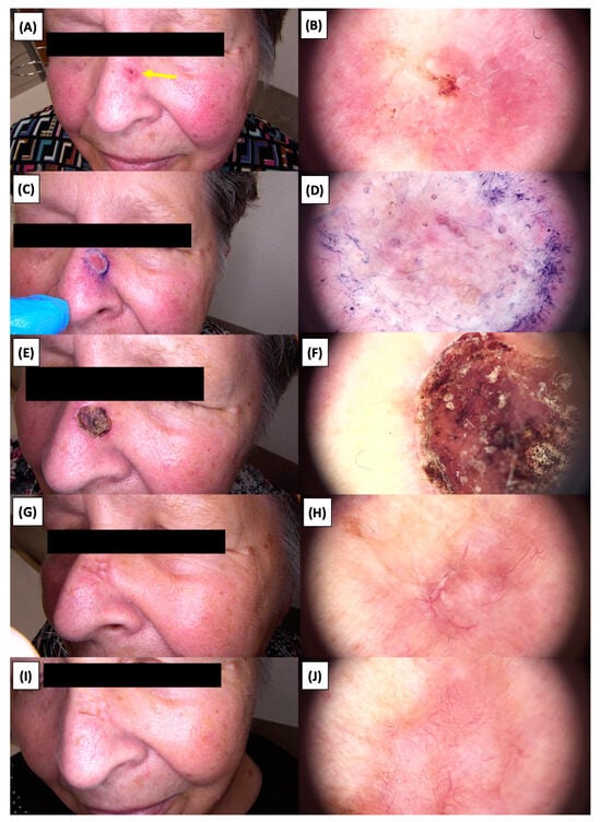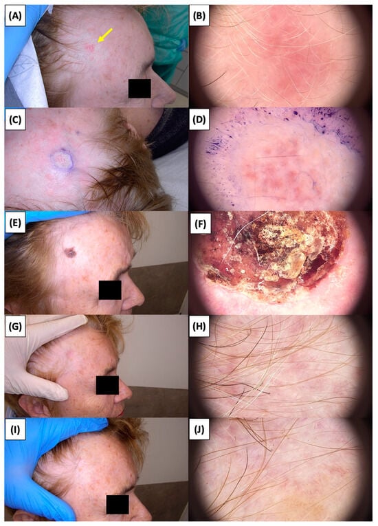 Involution of Basal Cell Carcinoma (BCC) on the temple treated with High-Intensity Focused Ultrasound (HIFU). (A) Macroscopic view before HIFU treatment; (B) Dermoscopic view before HIFU treatment; (C) Macroscopic view immediately after HIFU treatment; (D) Dermoscopic view immediately after HIFU treatment; (E) Macroscopic view 2 weeks post-HIFU; (F) Dermoscopic view 2 weeks post-HIFU; (G) Macroscopic view 3 months post-HIFU; (H) Dermoscopic view 3 months post-HIFU; (I) Macroscopic view 6 months post-HIFU; (J) Dermoscopic view 6 months post-HIFU. The yellow arrow indicates the area of the lesion.