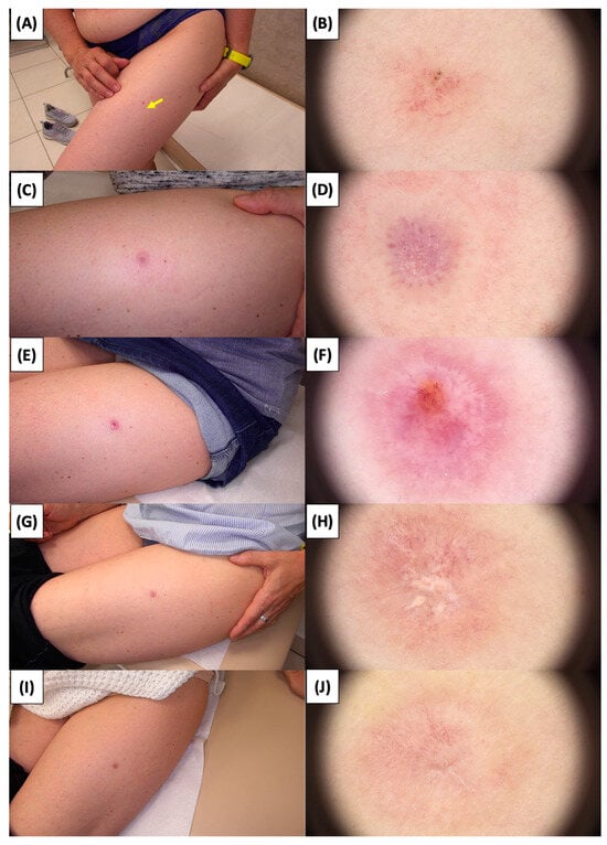 Involution of Basal Cell Carcinoma (BCC) on the thigh treated with High-Intensity Focused Ultrasound (HIFU). (A) Macroscopic view before HIFU treatment; (B) Dermoscopic view before HIFU treatment; (C) Macroscopic view immediately after HIFU treatment; (D) Dermoscopic view immediately after HIFU treatment; (E) Macroscopic view 2 weeks post-HIFU; (F) Dermoscopic view 2 weeks post-HIFU; (G) Macroscopic view 3 months post-HIFU; (H) Dermoscopic view 3 months post-HIFU; (I) Macroscopic view 6 months post-HIFU; (J) Dermoscopic view 6 months post-HIFU. The yellow arrow indicates the area of the lesion.