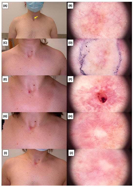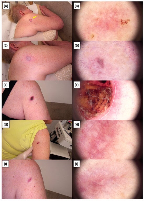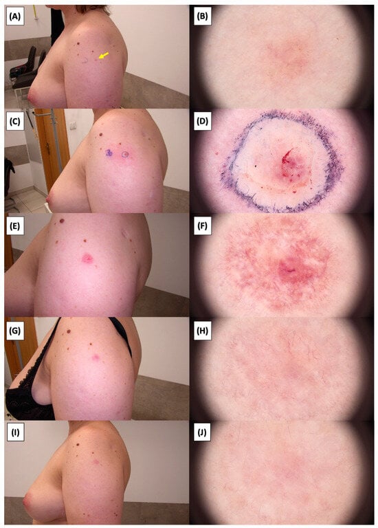 Involution of Basal Cell Carcinoma (BCC) on the upper arm treated with High-Intensity Focused Ultrasound (HIFU). (A) Macroscopic view before HIFU treatment; (B) Dermoscopic view before HIFU treatment; (C) Macroscopic view immediately after HIFU treatment; (D) Dermoscopic view immediately after HIFU treatment; (E) Macroscopic view 2 weeks post-HIFU; (F) Dermoscopic view 2 weeks post-HIFU; (G) Macroscopic view 3 months post-HIFU; (H) Dermoscopic view 3 months post-HIFU; (I) Macroscopic view 6 months post-HIFU; (J) Dermoscopic view 6 months post-HIFU. The yellow arrow indicates the area of the lesion.