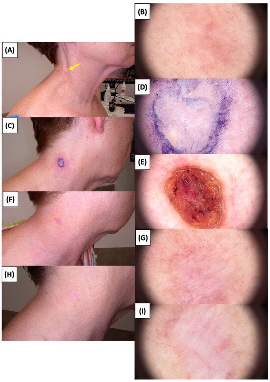 Involution of Basal Cell Carcinoma (BCC) on the neck treated with High-Intensity Focused Ultrasound (HIFU). (A) Macroscopic view before HIFU treatment; (B) Dermoscopic view before HIFU treatment; (C) Macroscopic view immediately after HIFU treatment; (D) Dermoscopic view immediately after HIFU treatment; (E) Macroscopic view 2 weeks post-HIFU; (F) Dermoscopic view 2 weeks post-HIFU; (G) Macroscopic view 3 months post-HIFU; (H) Dermoscopic view 3 months post-HIFU; (I) Macroscopic view 6 months post-HIFU. The yellow arrow indicates the area of the lesion.