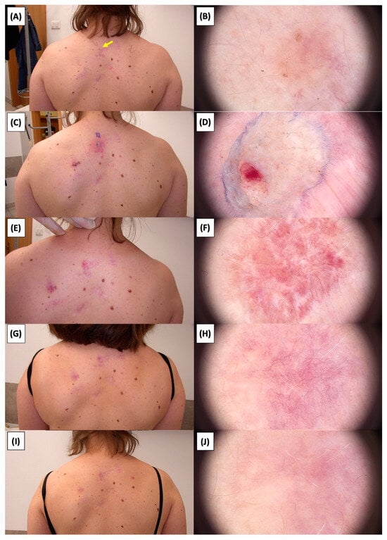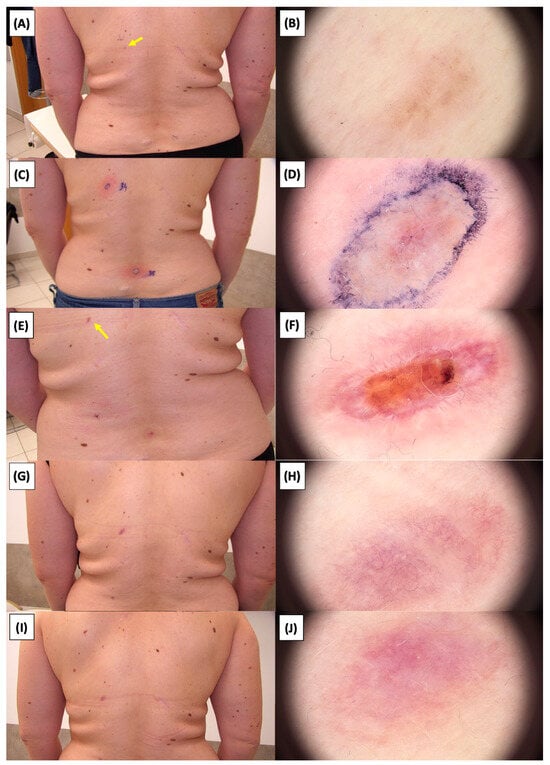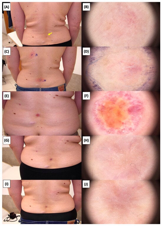Involution of Basal Cell Carcinoma (BCC) on the back treated with High-Intensity Focused Ultrasound (HIFU). (A) Macroscopic view before HIFU treatment; (B) Dermoscopic view before HIFU treatment; (C) Macroscopic view immediately after HIFU treatment; (D) Dermoscopic view immediately after HIFU treatment; (E) Macroscopic view 2 weeks post-HIFU; (F) Dermoscopic view 2 weeks post-HIFU; (G) Macroscopic view 3 months post-HIFU; (H) Dermoscopic view 3 months post-HIFU; (I) Macroscopic view 6 months post-HIFU; (J) Dermoscopic view 6 months post-HIFU. The yellow arrow indicates the area of the lesion.