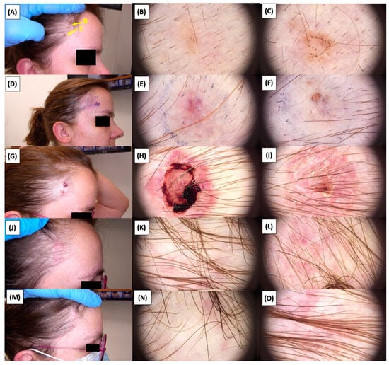 Involution of Basal Cell Carcinoma (BCC) on the temple back treated with High-Intensity Focused Ultrasound (HIFU). (A) Macroscopic view before HIFU treatment; (B) Dermoscopic view before HIFU treatment; (C) Dermoscopic view before HIFU treatment; (D) Macroscopic view immediately after HIFU treatment; (E) Dermoscopic view immediately after HIFU treatment; (F) Dermoscopic view immediately after HIFU treatment; (G) Macroscopic view 2 weeks post-HIFU; (H) Dermoscopic view 2 weeks post-HIFU; (I) Dermoscopic view 2 weeks post-HIFU; (J) Macroscopic view 3 months post-HIFU; (K) Dermoscopic view 3 months post-HIFU; (L) Dermoscopic view 3 months post-HIFU; (M) Macroscopic view 6 months post-HIFU; (N) Dermoscopic view 6 months post-HIFU; (O) Dermoscopic view 6 months post-HIFU. The yellow arrows indicate the area of the lesions.