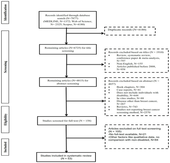 Chicago/Turabian StyleAlmohammed, Huda I. 2024. "A Systematic Review to Evaluate the Barriers to Breast Cancer Screening in Women with Disability" Journal of Clinical Medicine 13, no. 11: 3283. https://doi.org/10.3390/jcm13113283