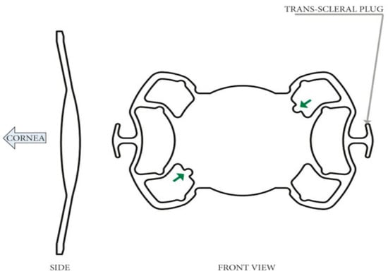 A Carlevale IOL is an acrylic one-piece lens with a total length of 13.2 mm and a 6.5 mm wide optic plate and an A-constant of 118.5 []. The 10° anterior angulation of the two haptics with respect to the optic plate avoids contact with the iris and should reduce the risk of a pupillary block []. The opposed T-shaped harpoons protruding off the closed haptics allow for self-anchoring to the sclera without sutures [,,] (Figure 2).