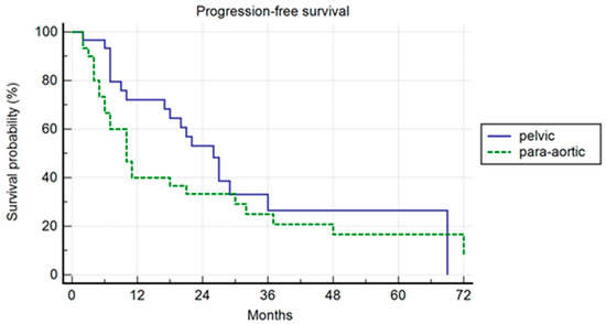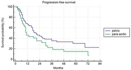 Kaplan–Meier curve showing progression-free survival (PFS) in the entire population stratified by lymphnode metastases site (pelvic versus para-aortic) (p = 0.06; HR 1.49; IC: 0.98–2.28).