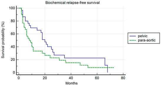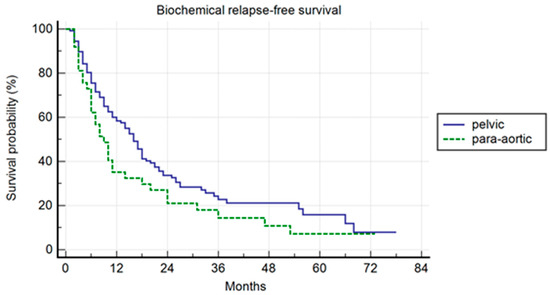 Kaplan–Meier curve biochemical relapse-free survival (BRFS) in the matched population stratified by lymphnode metastases site (pelvic versus para-aortic) (p = 0.14).