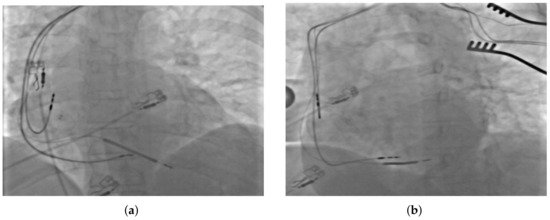 Fluoroscopic image presenting the final placement of all implanted leads in (a) antero-posterior, and (b) left anterior oblique projections.