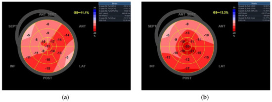 Bull’s eye diagram of left ventricle global longitudinal strain (LV-GLS): (a) before, and (b) after left bundle branch area pacing (LBBAP).